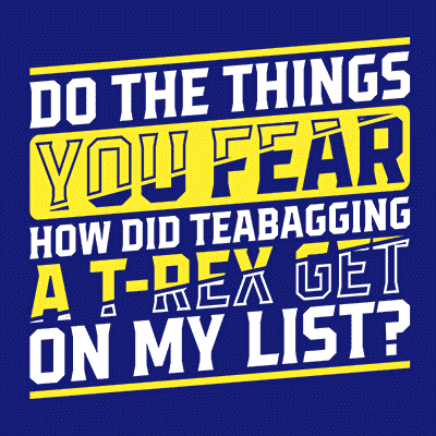 The Do the Things You Fear. How Did Teabagging a T-Rex Get On My List funny merch is one of our best sarcastic offerings. Hey, being afraid is no fun, so by taking some risks and doing the things you fear will help with this (to a point). Offering funny sarcastic t-shirts, hoodies, sweatshirts, long sleeve tees, coffee mugs, notebooks, men’s underwear, facemasks plus and more. Buy today!