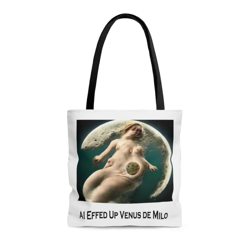This practical, high-quality AI Effed Up Venus de Milo Tote Bag is available in three sizes. All over print provides comfort with style at the beach or out in town. Made from reliable materials, lasting for seasons. If you like funny AI art and are a fan of Venus de Milo then buy this tote bag now!