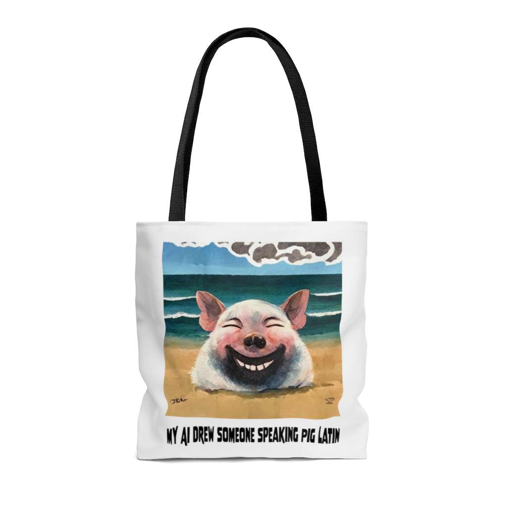 This practical, high-quality Pig Latin funny AI art Tote Bag is available in three sizes. All over print provides comfort with style at the beach or out in town. Made from reliable materials, lasting for seasons. If you like funny plus AI art and pigs, then buy this!