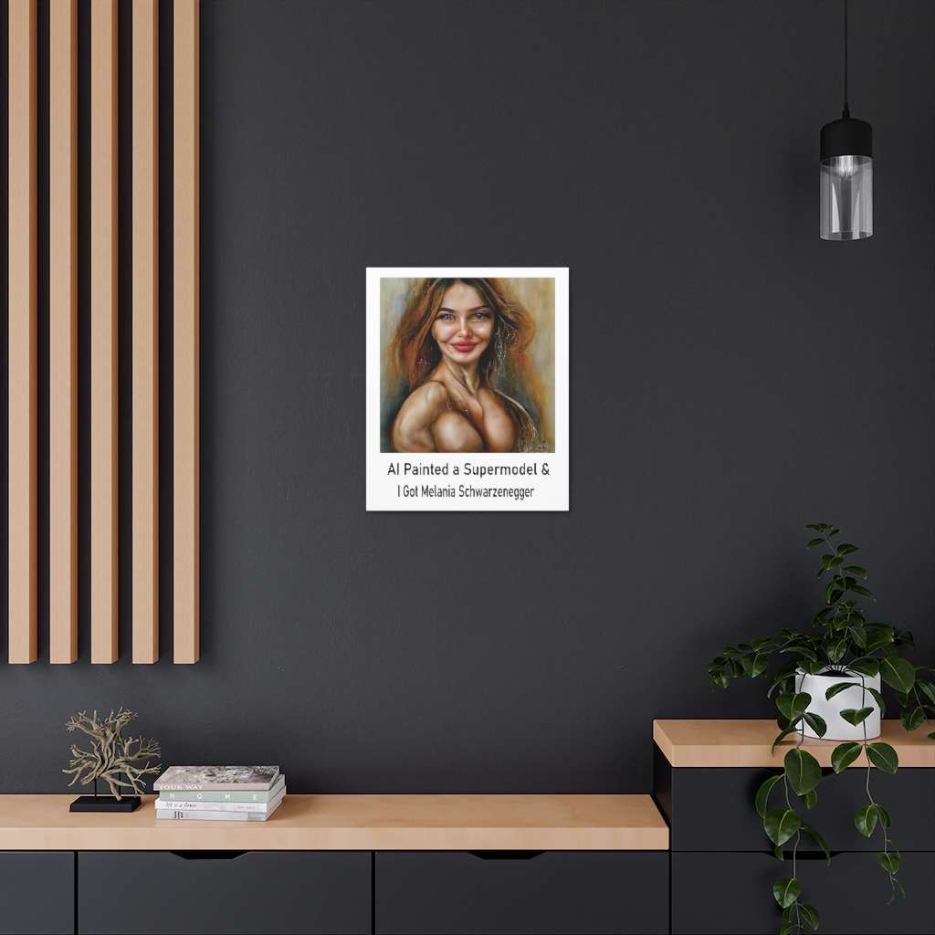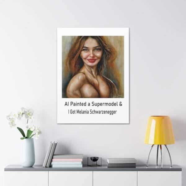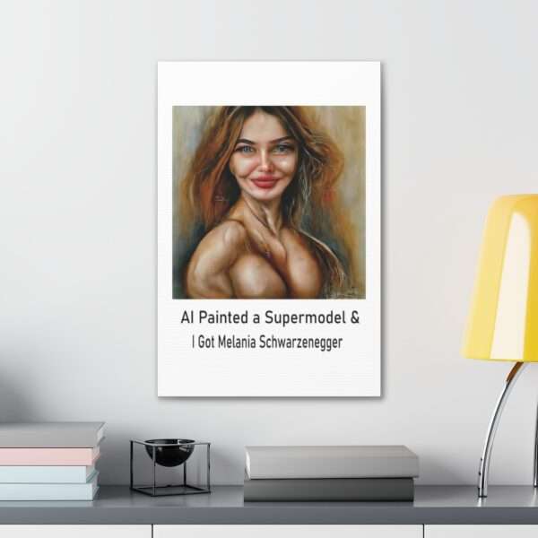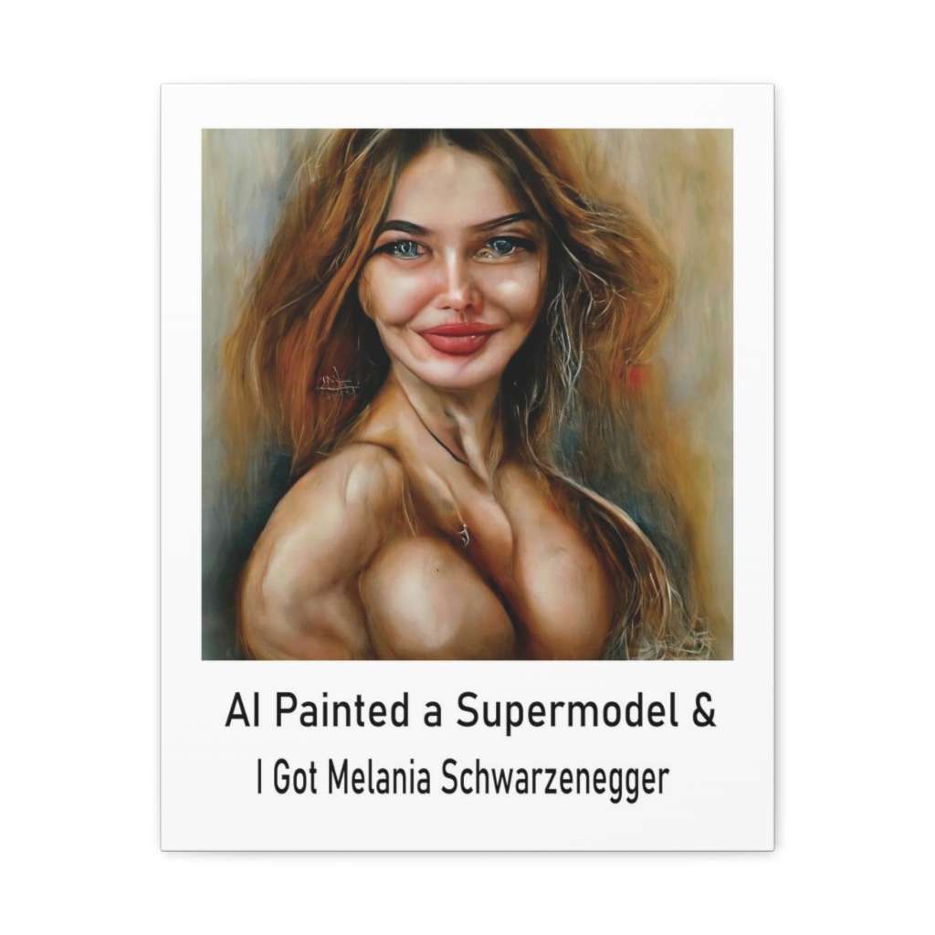 Uplift any room’s decor with a design that’s printed on top-quality funny AI art Melania Schwarzenegger funny canvas art gallery wraps. Each AI Painted a Supermodel & I Got Melania Schwarzenegger wrap is made with finely textured, artist-grade cotton substrate which helps reproduce your image in outstanding clarity and detail. Available in multiple sizes, these closed back AI Painted a Supermodel & I Got Melania Schwarzenegger funny canvas art canvases are built with a patented, solid support face and are excellent for indoor use. If you’re a fan of AI plus supermodel mashup Melania Schwarzenegger, then buy this funny canvas art print now!