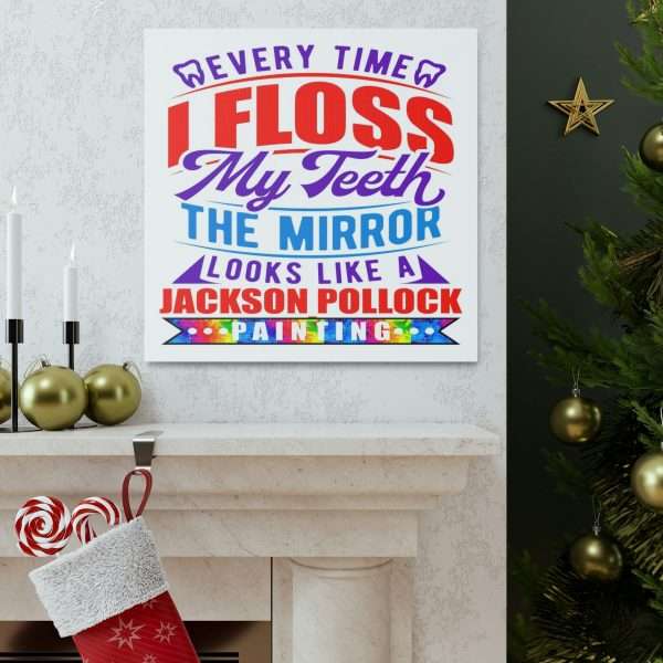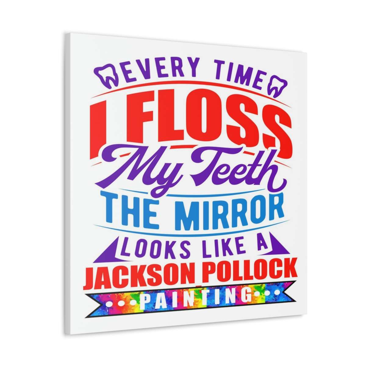 This Every Time I Floss My Teeth the Mirror Looks Like a Jackson Pollock Painting funny canvas art print is a wonderful addition to a room in which you’d like to add some humor and color! Our premium Every Time I Floss My Teeth funny canvas art is created from an artist-grade finely textured cotton substrate that shows off this humorous design with its ultimate vibrancy, detail and clarity.