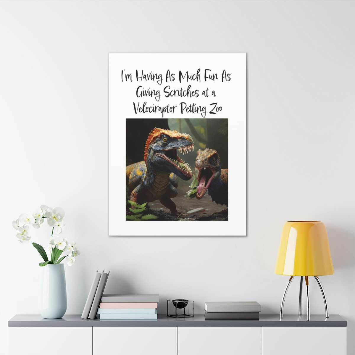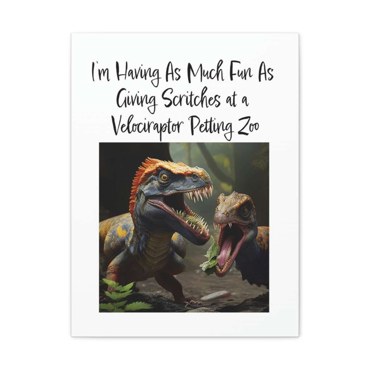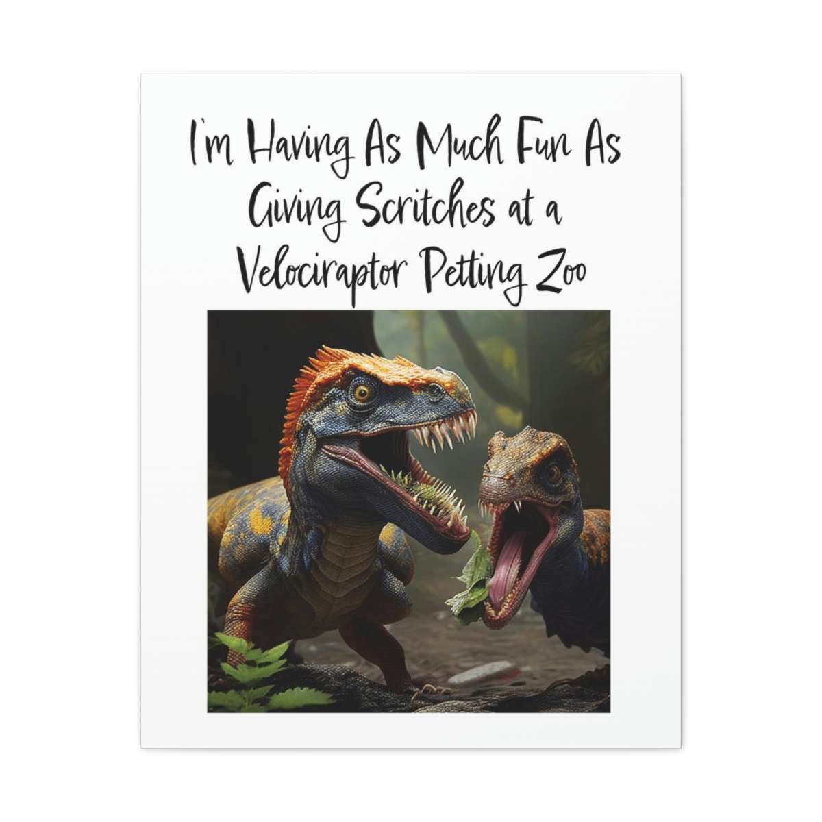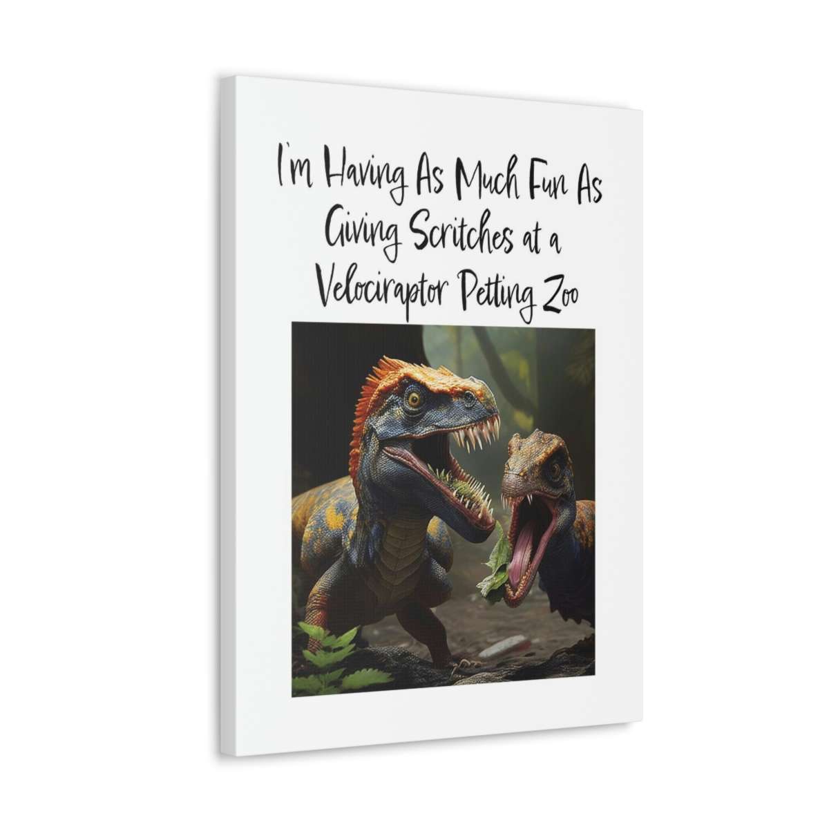 This Velociraptor Petting Zoo funny canvas art print is a wonderful addition to a room in which you’d like to add some humor and color! Our premium Velociraptor Petting Zoo funny canvas art is created from an artist-grade finely textured cotton substrate that shows off this humorous design with its ultimate vibrancy, detail and clarity. Buy this Velociraptor Petting Zoo funny canvas art print gallery wrap now!