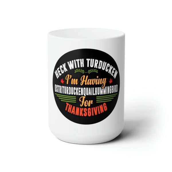 Spark your life with a cup of hot Joe, or GI Jane or Mr. Tea with this premium large, 15 oz funny white ceramic Heck with Turducken I’m Having Ostriturduckenquailhummingbird for Thanksgiving coffee mug. Our large 15-ounce Heck with Turducken I’m Having Ostriturduckenquailhummingbird for Thanksgiving coffee mug is sure to get a laugh from friends and family. The large premium funny coffee mug with C-handle and rounded corners is microwave-safe and can be washed by hand in the sink or by using a dishwasher. Buy this Heck with Turducken I’m Having Ostriturduckenquailhummingbird for Thanksgiving funny coffee mug today and get some laughs soon!