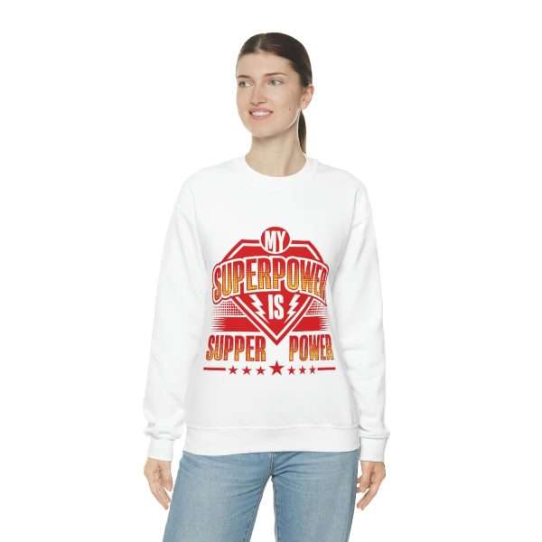 Great for any casual occasion, the humorous My Superpower Is Supper Power unisex heavy blend crewneck sweatshirt is pure comfort. Our My Superpower Is Supper Power sweatshirts are made from cotton and polyester. These fabrics help the My Superpower Is Supper Power design to stand out on the garment. The collar of the hilarious crewneck sweatshirt is ribbed knit, enabling it to maintain its shape one washing after another. These funny sweatshirts don’t contain any itchy side-seams. Buy a funny My Superpower Is Supper Power unisex heavy blend crewneck sweatshirt today!