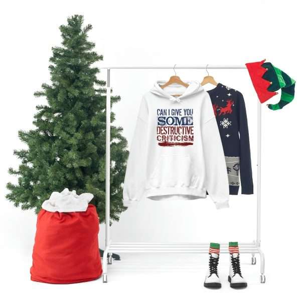 Our Can I Give You Some Destructive Criticism humorous unisex heavy blend hoodie sweatshirt is one to relax in. The cotton and polyester blends of the Can I Give You Some Destructive Criticism hoodie sweatshirts are thick and comfortable. The humorous Can I Give You Some Destructive Criticism garments are not only warm but soft was well. The combination of materials is well-suited for vibrancy in the design. No side seams mean no itching. In front of the funny hoodie, a large kangaroo pocket hangs near the bottom. The humorous hoodie’s drawstring is the same color as the rest of the heavy blend sweatshirt. Buy a funny Can I Give You Some Destructive Criticism hoodie today!
