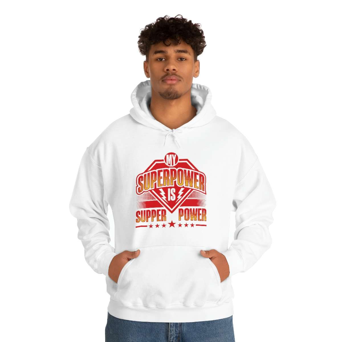 Our My Superpower Is Supper Power humorous unisex heavy blend hoodie sweatshirt is one to relax in. The cotton and polyester blends of the My Superpower Is Supper Power hoodie sweatshirts are thick and comfortable. The humorous My Superpower Is Supper Power garments are not only warm but soft was well. The combination of materials is well-suited for vibrancy in the design. No side seams mean no itching. In front of the funny hoodie, a large kangaroo pocket hangs near the bottom. The humorous hoodie’s drawstring is the same color as the rest of the heavy blend sweatshirt. Buy a My Superpower Is Supper Power funny hoodie today!
