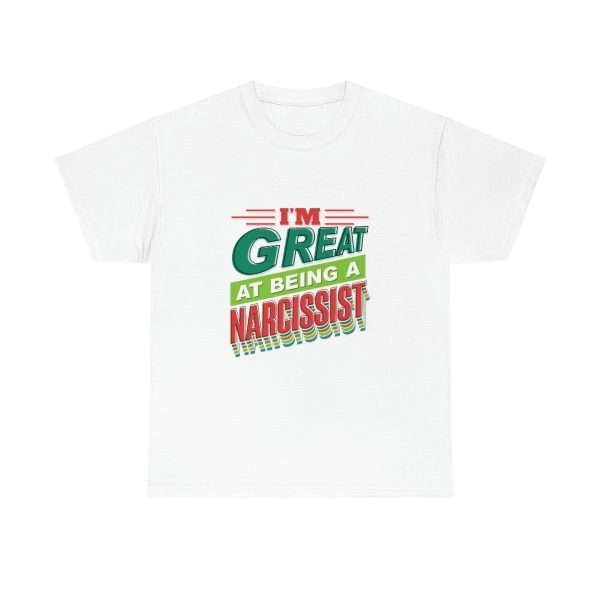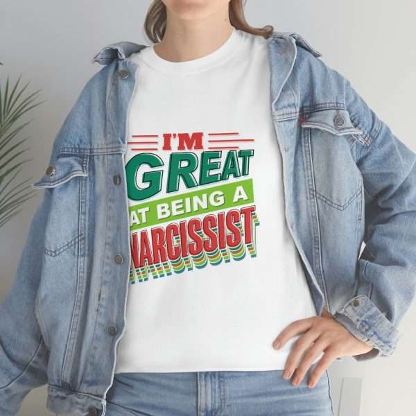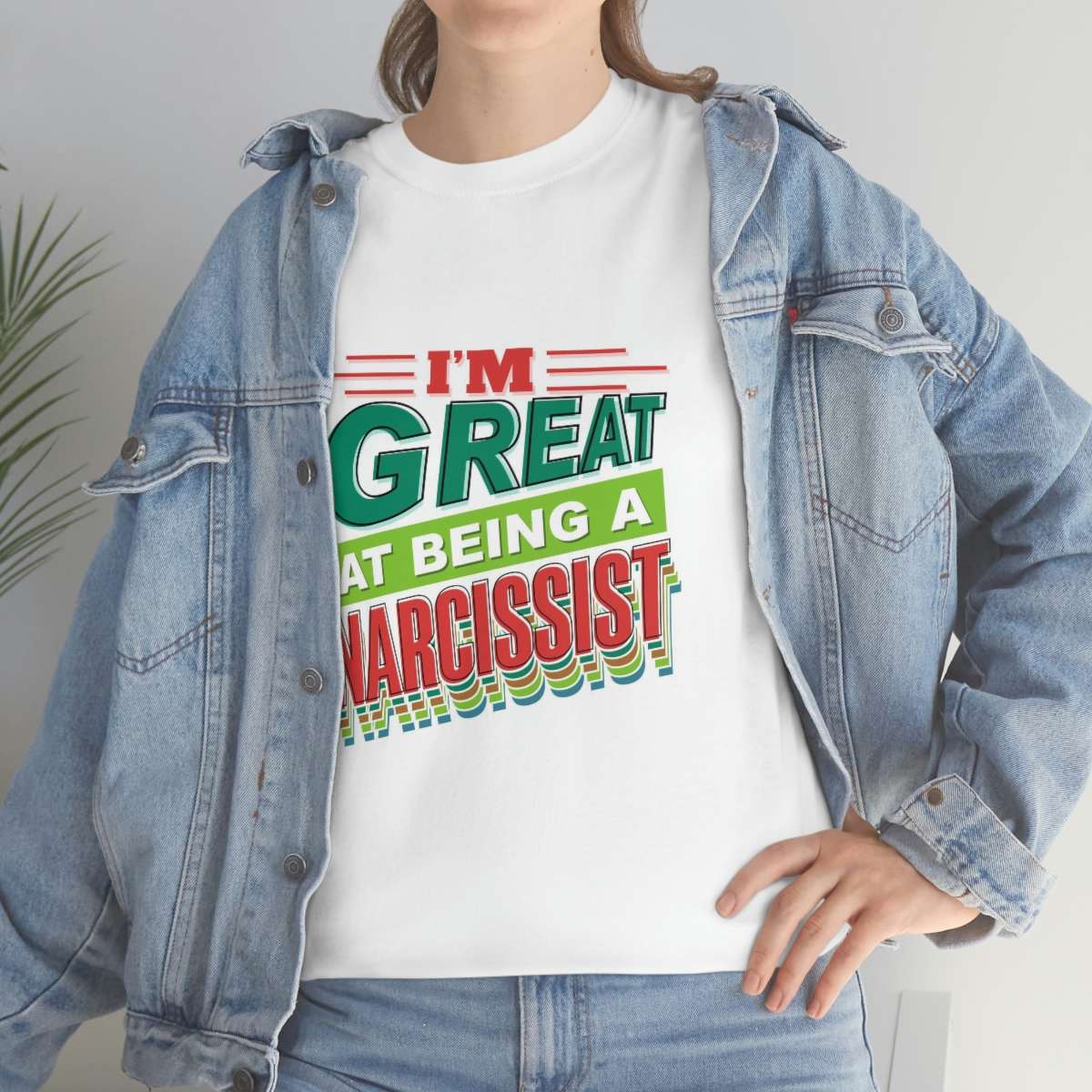 Our funny I’m Great at Being a Narcissist unisex heavy cotton t-shirt is welcome in any casual wardrobe. This heavy cotton I’m Great at Being a Narcissist t-shirt will get a laugh from friends and family. This humorous design will spark conversations for years to come. The excellent cotton fibers provide a viable surface for the funny print to shine to its fullest. The under arms of the humorous I’m Great at Being a Narcissist heavy cotton t-shirt have no side seams which mean comfort while retaining the shape of the garment. The shoulders are taped which make the funny tee more durable. Buy a funny I’m Great at Being a Narcissist unisex heavy cotton t-shirt today!