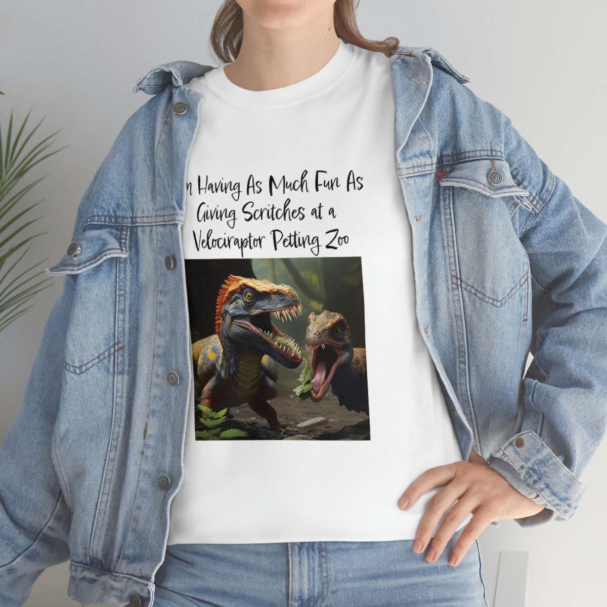 Our Velociraptor Petting Zoo funny unisex heavy cotton t-shirt is welcome in any casual wardrobe. This heavy cotton Velociraptor Petting Zoo t-shirt will get a laugh from friends and family. This humorous Velociraptor Petting Zoo design will spark conversations for years to come. The excellent cotton fibers provide a viable surface for the funny print to shine to its fullest. The under arms of the humorous heavy cotton t-shirt have no side seams which mean comfort while retaining the shape of the garment. The shoulders are taped which make the funny tee more durable. Buy a Velociraptor Petting Zoo funny unisex heavy cotton t-shirt today!