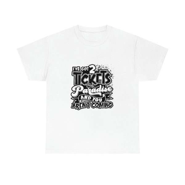 Our funny I’ve Got 2 Tickets to Paradise and You Aren’t Coming unisex heavy cotton t-shirt is welcome in any casual wardrobe. This heavy cotton I’ve Got 2 Tickets to Paradise and You Aren’t Coming t-shirt will get a laugh from friends and family. This humorous design will spark conversations for years to come. The excellent cotton fibers provide a viable surface for the funny I’ve Got 2 Tickets to Paradise and You Aren’t Comingprint to shine to its fullest. The under arms of the humorous heavy cotton t-shirt have no side seams which mean comfort while retaining the shape of the garment. The shoulders are taped which make the funny tee more durable. Buy a funny I’ve Got 2 Tickets to Paradise and You Aren’t Coming unisex heavy cotton t-shirt today!