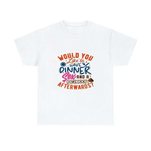 Buy a Would You Like to Have Dinner, Sex and a Nice Poop Afterwards funny unisex heavy cotton t-shirt today!