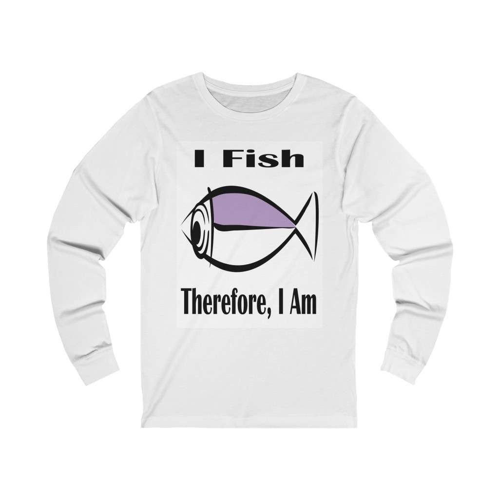 Our classic and humorous I Fish, Therefore I Am Jersey unisex long sleeve t-shirt fits like you’ve had it forever. Get a big laugh from family and friends. Casual attire with a top tier quality I Fish, Therefore I Am print, this Jersey long sleeve t-shirt is a must have item for everyone with a sense of humor. The Jersey tee is made with airlume combed, ringspun cotton fiber. Buy this funny unisex long sleeve I Fish, Therefore I Am Jersey t-shirt today and get some laughs soon!
