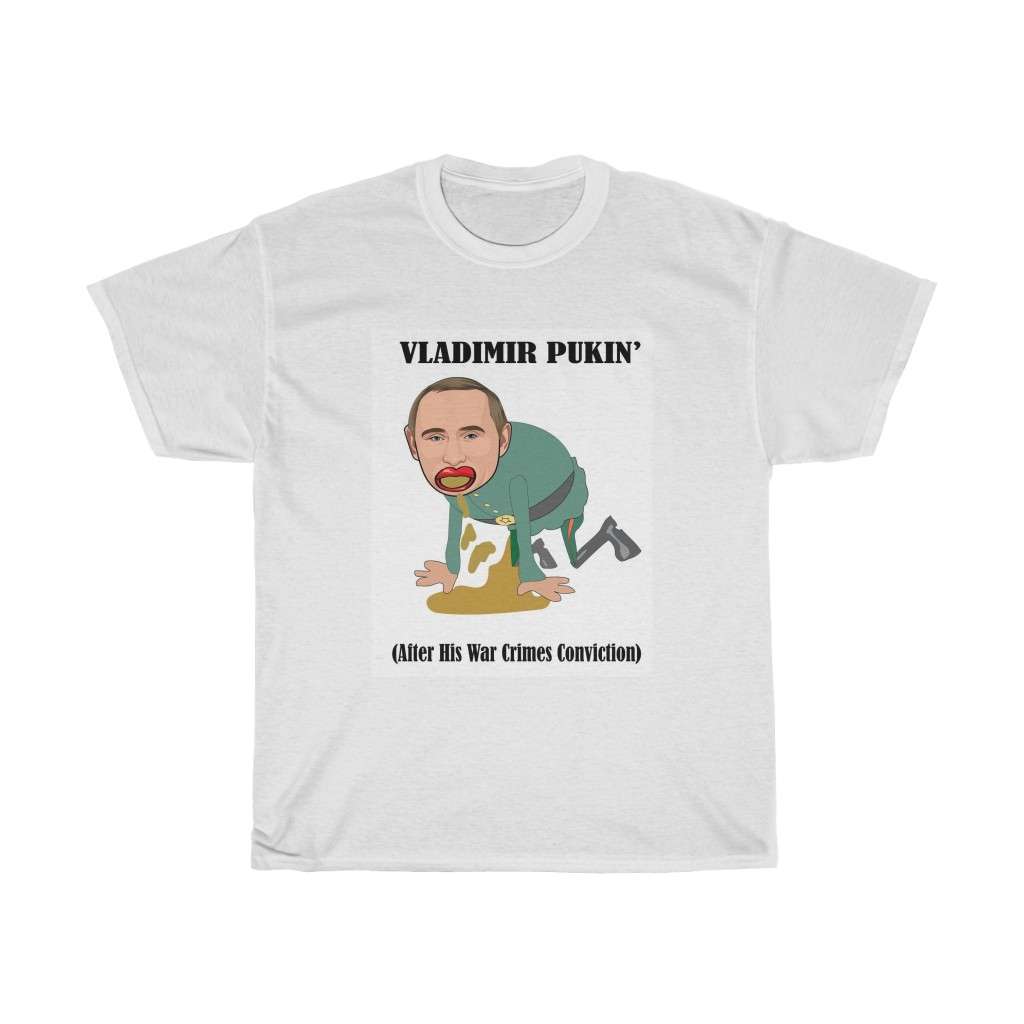 Our Vladimir Pukin’ (After His War Crimes Conviction) humorous unisex heavy cotton t-shirt is welcome in any casual wardrobe. This heavy cotton Vladimir Pukin’ t-shirt will get a laugh from friends and family. This humorous Vladimir Pukin’ design will spark conversations for years to come. The excellent cotton fibers provide a viable surface for the funny print to shine to its fullest. The under arms of the humorous heavy cotton t-shirt have no side seams which mean comfort while retaining the shape of the garment. The shoulders are taped which make the funny tee more durable. Buy a Vladimir Pukin’ funny unisex heavy cotton t-shirt today!