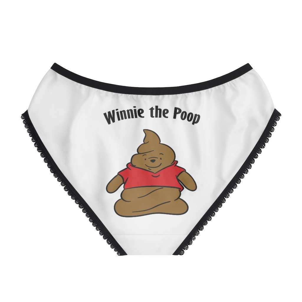 Gals, it’s time to create your unique look from head to camel toe with cute and comfy Winnie the Poop funny women’s panties! Our 2.2 oz lightweight Winnie the Poop humorous women’s underwear are made of 100-percent polyester and provide the most comfort where needed in your hoo-ha area. The waistband of the panty is soft elastic with a 2-sided fleece finish to avoid pinching. These Winnie the Poop funny panties are white overall with black trim. They ship from China, so they take 2 weeks to arrive. Buy these Winnie the Poop funny women’s panties today!